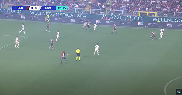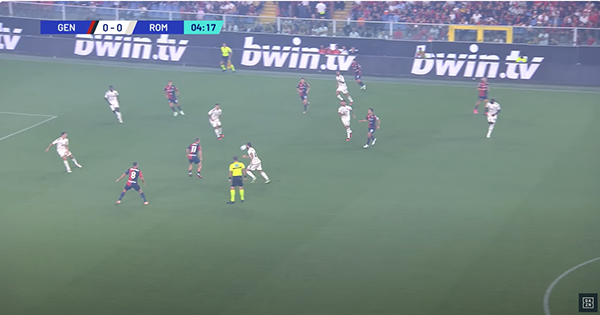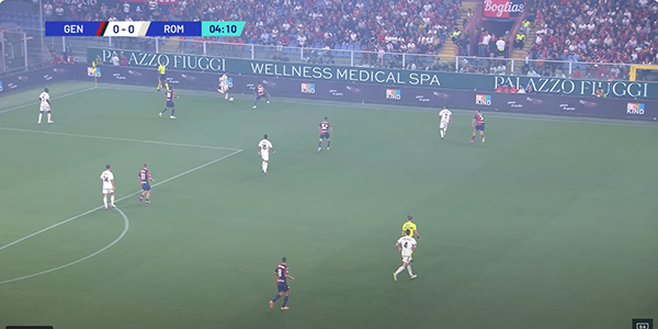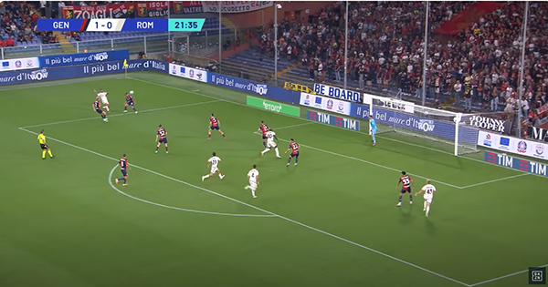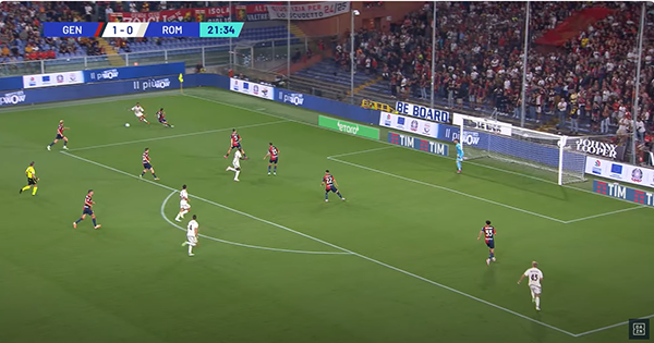 L’azione riprende. Ci sono tanti uomini giallorossi a copertura ma nessuno fa la cosa giusta. Bove si fa saltare facile.