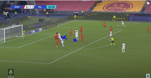 0-2 MilanPassiamo al raddoppio. Sul cross si fa fatica a capire chi stia facendo il primo errore. Mi spiego meglio. Smalling è su Giroud ma c’è un uomo al centro dell’area completamente solo. Cristante in teoria dovrebbe restare fuori a chiudere l’eventuale respinta o in caso di un cross basso verso la lunetta dell’area. In realtà li dovrebbe esserci Paredes che invece è più vicino a Zalewski e quindi Bryan seguire l’avversario. Se il cross arrivasse al centro area, ci sarebbe un giocatore lasciato solo e in grado di colpire facilmente di testa. Chi lo deve marcare? Smalling lasciando Giroud a Mancini o Cristante in copertura?
