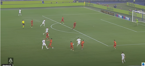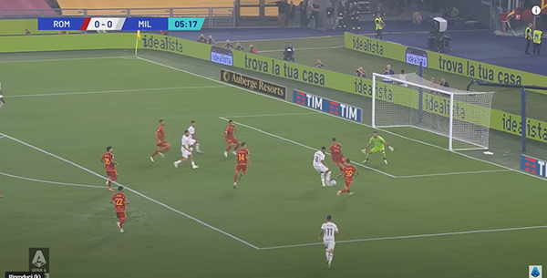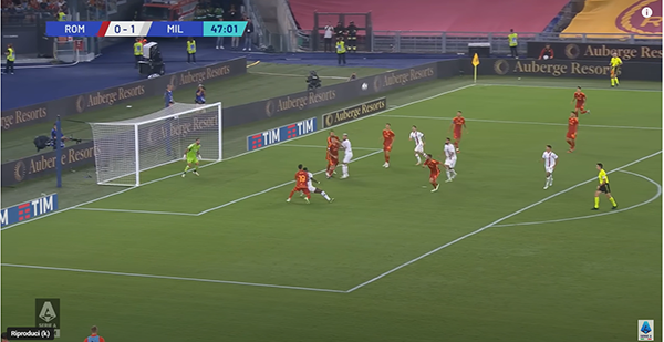 La difesa viene tagliata come il burro anche se, Mancini, Celik e Zalewski, ben posizionati, contribuiscono alla chiusura di Loftus-Cheek. Il suo tiro infatti viene respinto da Gianluca ma la carambola sorpassa Rui Patricio che, nel tentativo di fermare il pallone, allunga la gamba colpendo l’avversario. Celik è in anticipo e la butta fuori ma il regolamento parla chiaro (quando non tocca a noi usufruirne, ovvio): danno procurato.